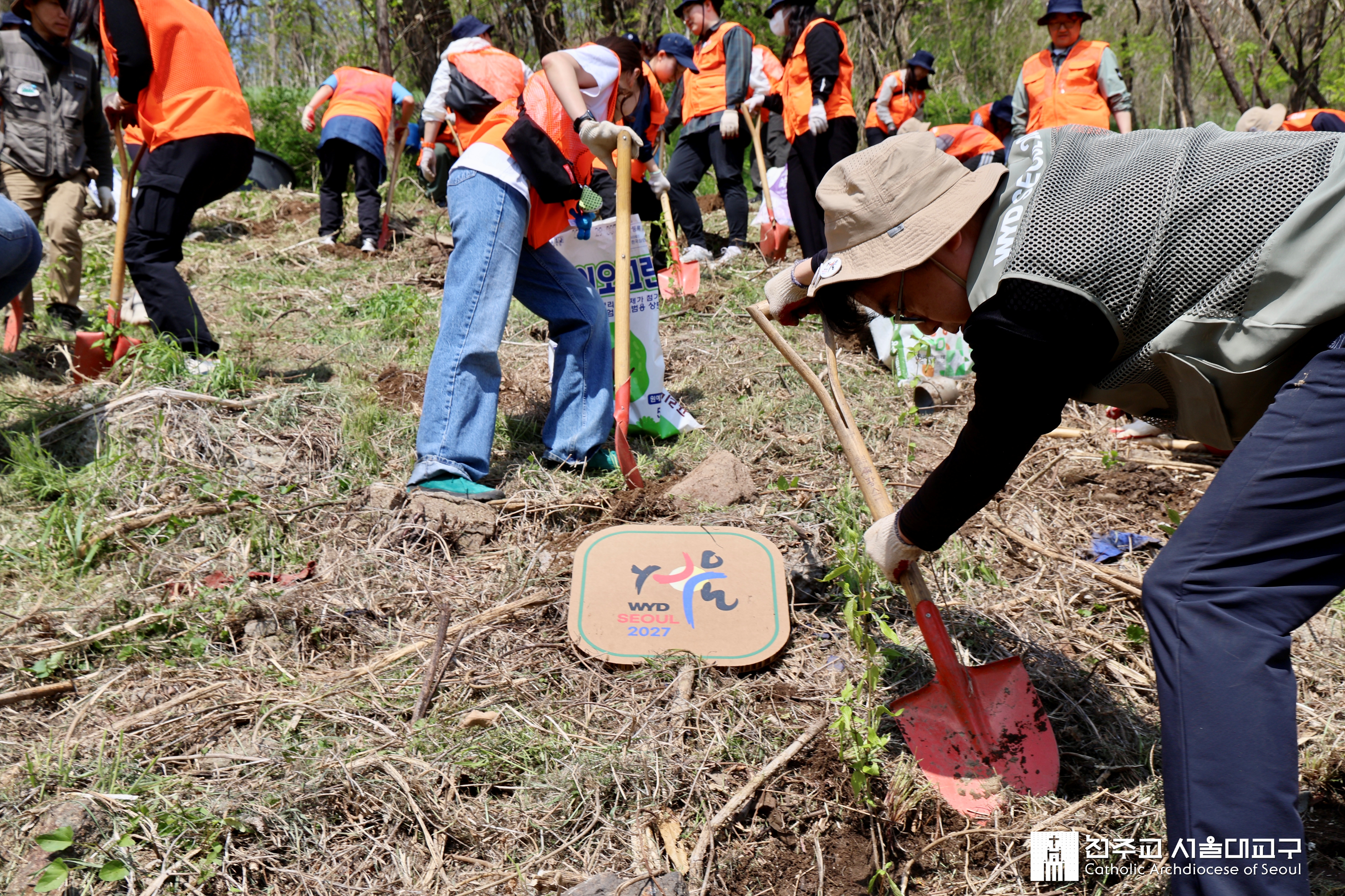 On Saturday, April 26, the first event in a series of symbolic tree-planting initiatives was held on the southern slope of Haneul Park in Sangam World Cup Park. The event is part of the “Breathe Life into the Whole World” campaign, a three-year ecological movement leading up to the 2027 World Youth Day (WYD), which will be hosted in Seoul. Approximately 80 volunteers, including youth representatives, volunteers, and clergy, participated in this meaningful afternoon of environmental action.