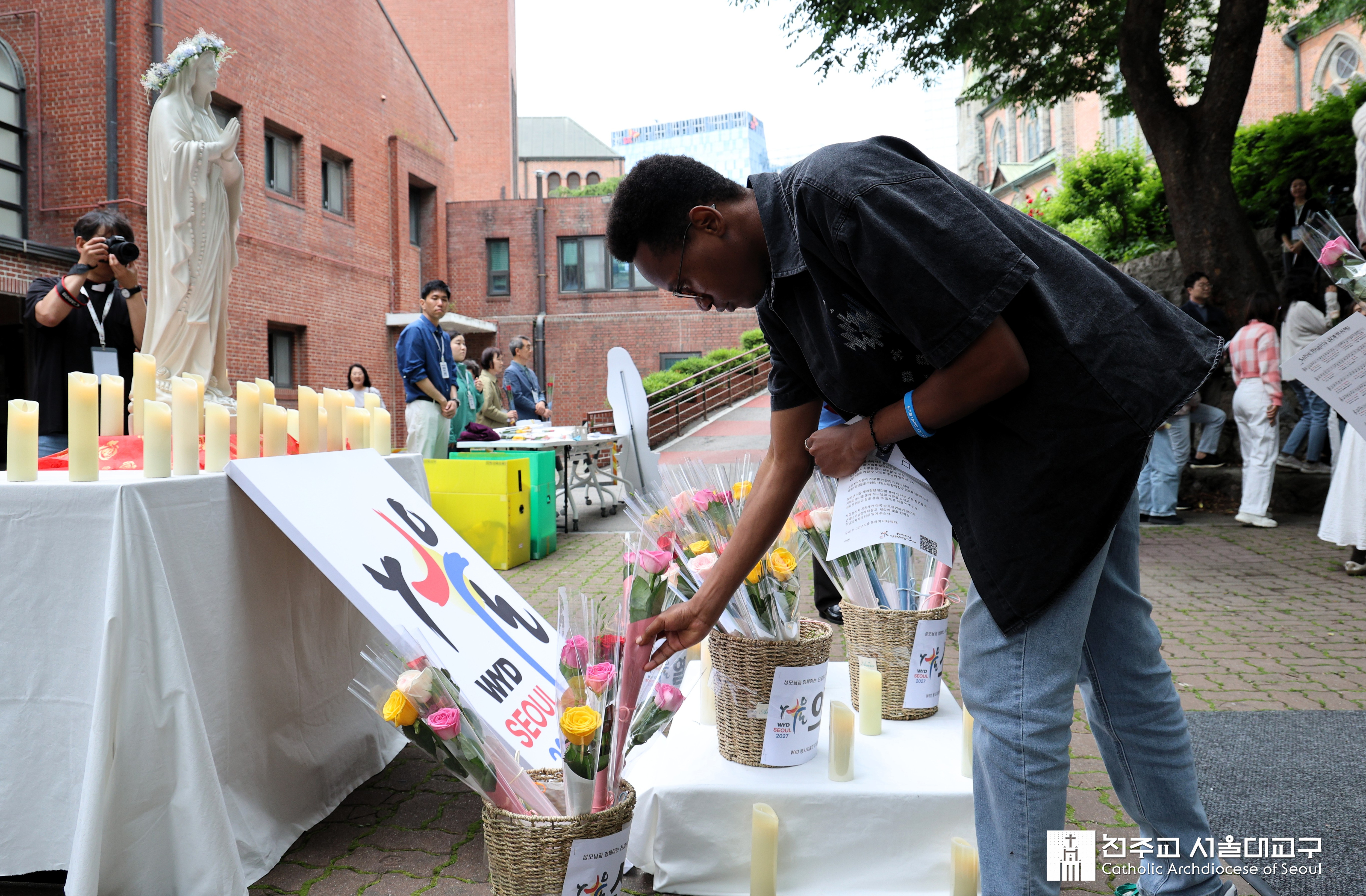 The evening commenced with the May Crowning, a Marian devotion presided over by Bishop Paul Kyeong-sang Lee, General Coordinator of the WYD Seoul 2027 LOC. It opened with gentle meditations and Marian hymns, drawing participants into a spirit of calm reflection and communal prayer. Volunteers then came forward one by one to offer a rose to Mary, each choosing from five baskets representing a personal intention: communications, humbleness, enthusiasm, trustful surrender, and devout faith. This symbolic act allowed them to express what they hoped to cultivate spiritually through their work in preparation for WYD.